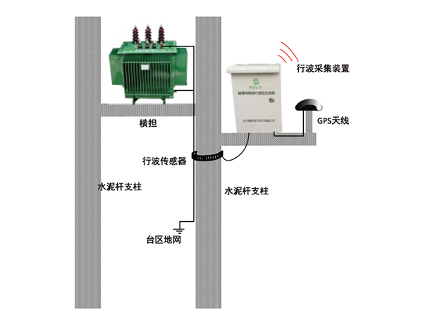 配電網(wǎng)故障行波定位系統包含故障行波采集終端和行波定位主站兩部分。通過(guò)在變電站及饋線(xiàn)重要分支末端配電臺區選擇性安裝故障行波采集終端,檢測容性設備地線(xiàn)(如:變壓器接地線(xiàn)、電纜屏蔽層接地線(xiàn)等)的故障行波信號,記錄故障行波波頭到達故障行波采集終端的ns級高精度衛星同步時(shí)間。故障行波定位主站利用各行波采集終端記錄的時(shí)間差,準確計算電網(wǎng)故障點(diǎn)位置,誤差小于100m;并由各分支上故障行波信號出現的時(shí)間先后關(guān)系進(jìn)行故障選線(xiàn)。